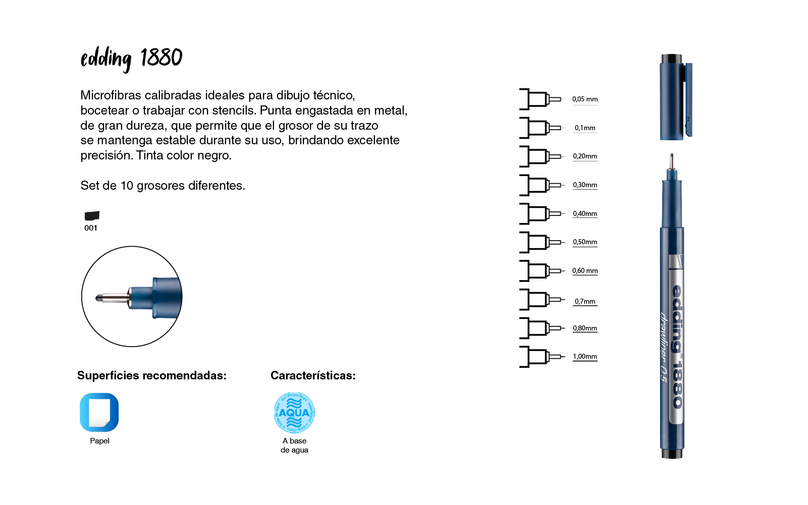 Estílógrafo de precisión para bocetos precisos en papel de color claro. El set incluye anchos de trazo 0,05 / 0,1/ 0,2/ 0,3 / 0,4 / 0,5 / 0,6 / 0,7 / 0,8 / 1,0 mm. La tinta pigmentada es resistente al agua y extremadamente resistente a la luz.