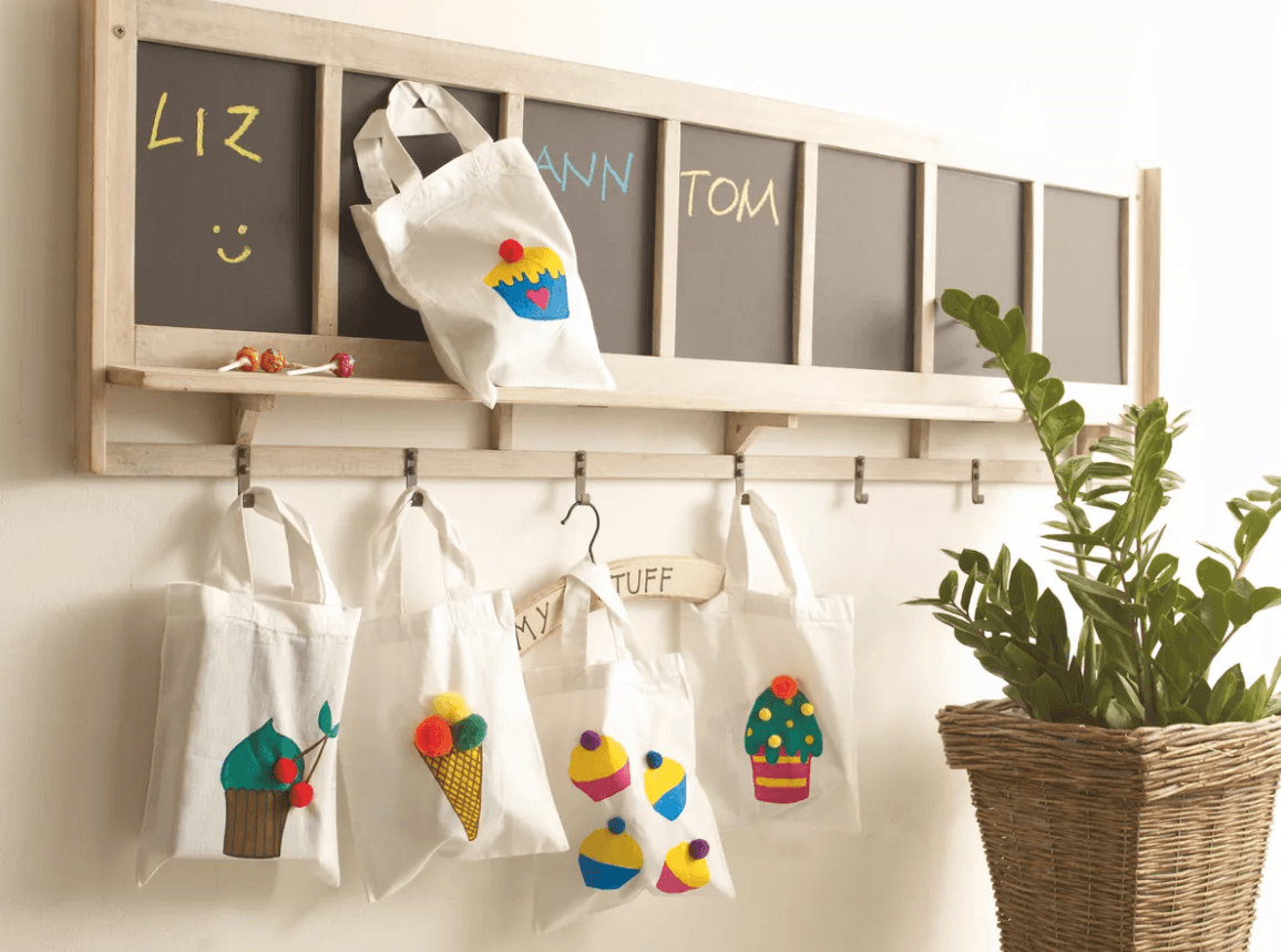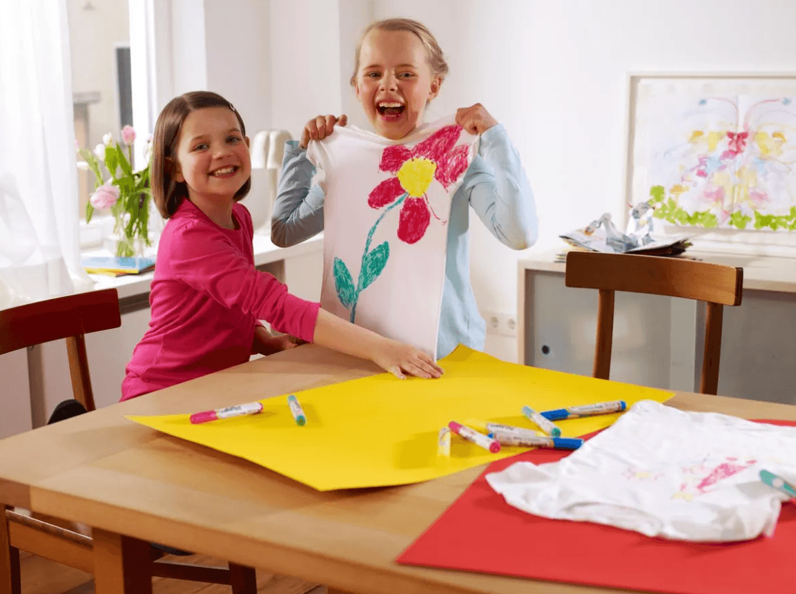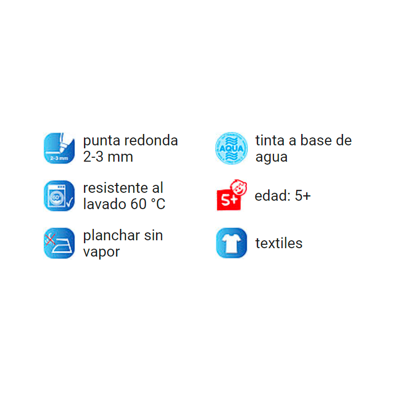 Set de marcadores para niños. Especiales para tela. Para disfrutar dibujando con un toque colorido sobre la mayoría de los textiles livianos con alto contenido de algodón ( 100% algodón, seda, lino, etc.). La punta gruesa redonda tiene un grosor de trazo de 2-3 mm. La tinta pigmentada a base de agua es resistente al lavado; después de fijar los colores planchando el tejido (sin vapor) del lado del revés, los textiles se pueden lavar en lavadora a una temperatura de hasta 60 °C. Cumple la norma CE sobre juguetes adecuados para los niños. El set contiene color amarillo, marrón, celeste, carmín y verde pálido.