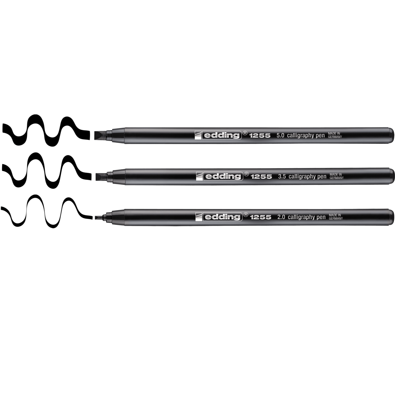 No hay nada tan elegante como una caligrafía bonita. ¿No le encanta la escritura tan exquisita de los libros, certificados o documentos antiguos? Pues con edding usted puede lograr esos mismos resultados. Lo que antes se hacía con pluma de ganso y pincel, se puede lograr ahora fácilmente con este rotulador caligráfico. Con él, resulta fácil conseguir una caligrafía elegante sobre papel y cartón de color claro. Estos rotuladores caligráficos ayudan a los principiantes a plasmar con facilidad diseños creativos, mientras que los diseñadores gráficos e ilustradores profesionales pueden utilizarlos como herramientas sencillas y fiables, con resultados garantizados. Gracias a su punta biselada especial, cualquiera puede disfrutar de una escritura elegante; basta con sostener el rotulador con la misma inclinación en todo momento.El set caligráfico incluye tres rotuladores e-1255 con grosores de trazo diferentes: 2, 3,5 y 5 mm, en color negro. Su tinta a base de agua no traspasa el papel. Puede contar con resultados resistentes a la luz, al roce y al agua.