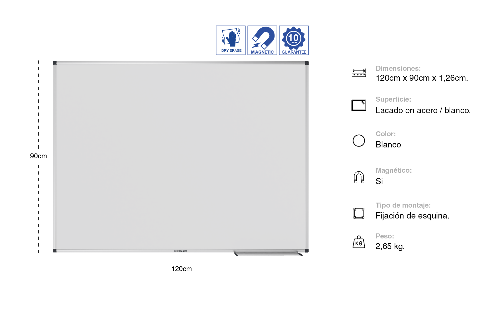 Pizarra blanca sostenible para uso ocasional en la oficina, el aula o el entorno industrial. Adecuado para escribir sobre él con marcadores para pizarras blancas de borrado en seco. Superficie magnética de acero lacado. Marco de aluminio con esquinas de plástico gris (Pantone 433C) Puede montarse horizontal o verticalmente. Incluye bandeja para marcadores (30 cm), juego de montaje e instrucciones de montaje.