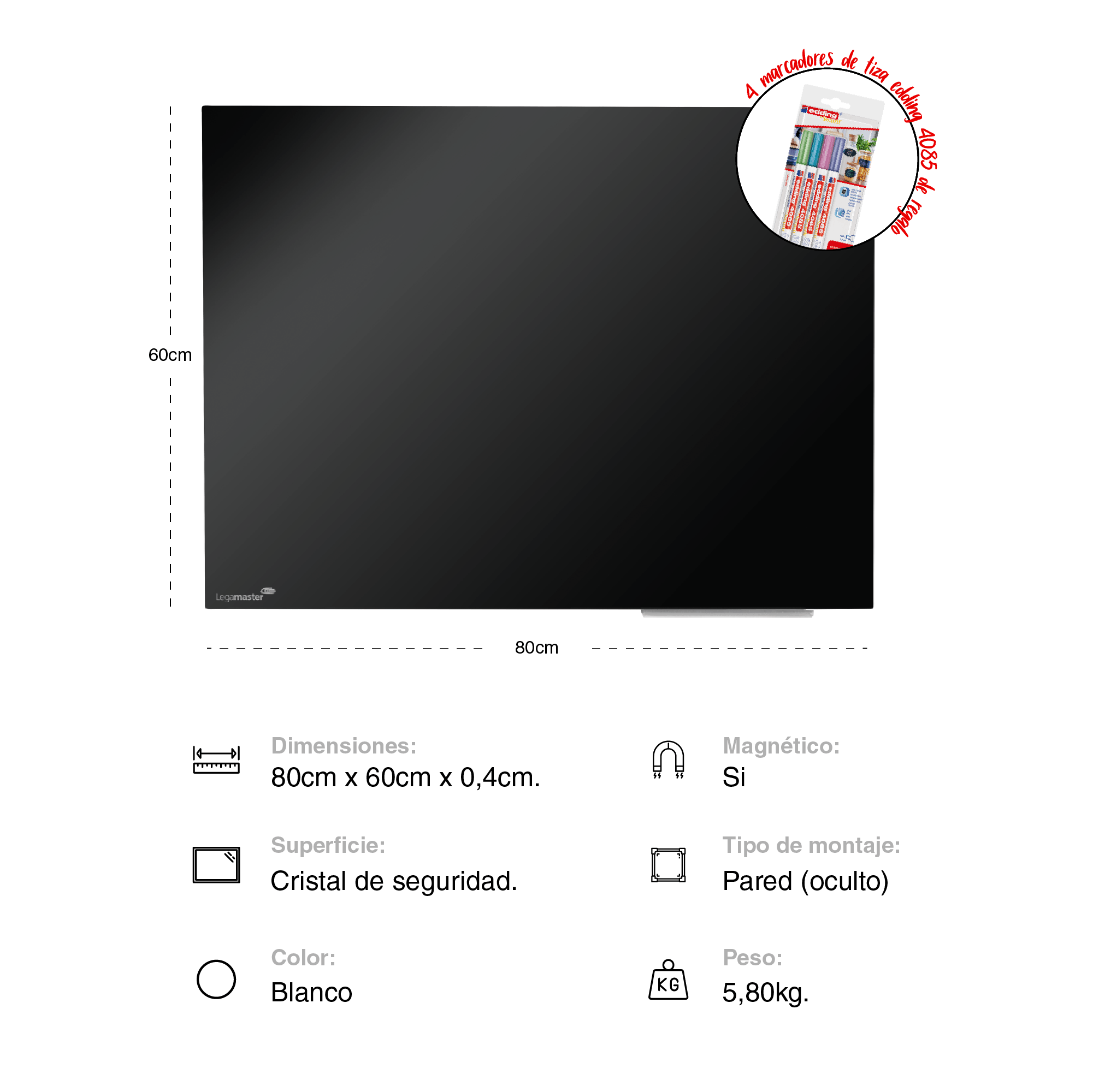 Pizarra de cristal sin marcos de alta calidad para uso intensivo y prolongado.Adecuada para escribir sobre ella con marcadores de tiza o marcadores para pizarras blancas de borrado en seco.Vidrio de seguridad templado y superficie de vidrio magnético (4 mm).Puede montarse horizontal o verticalmente con el sistema de montaje oculto.Incluye 2 imanes súper fuertes (diám. 12 mm), 1 marcador de tiza Legamaster, juego de montaje e instrucciones de montaje.