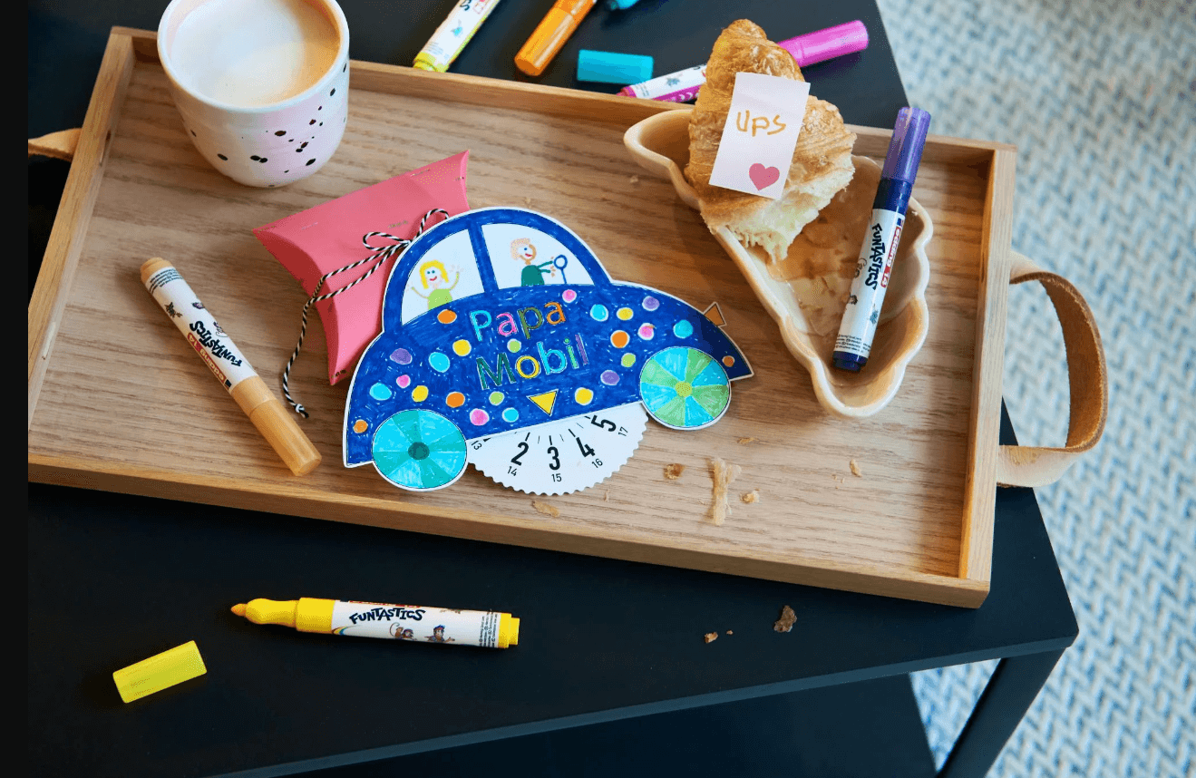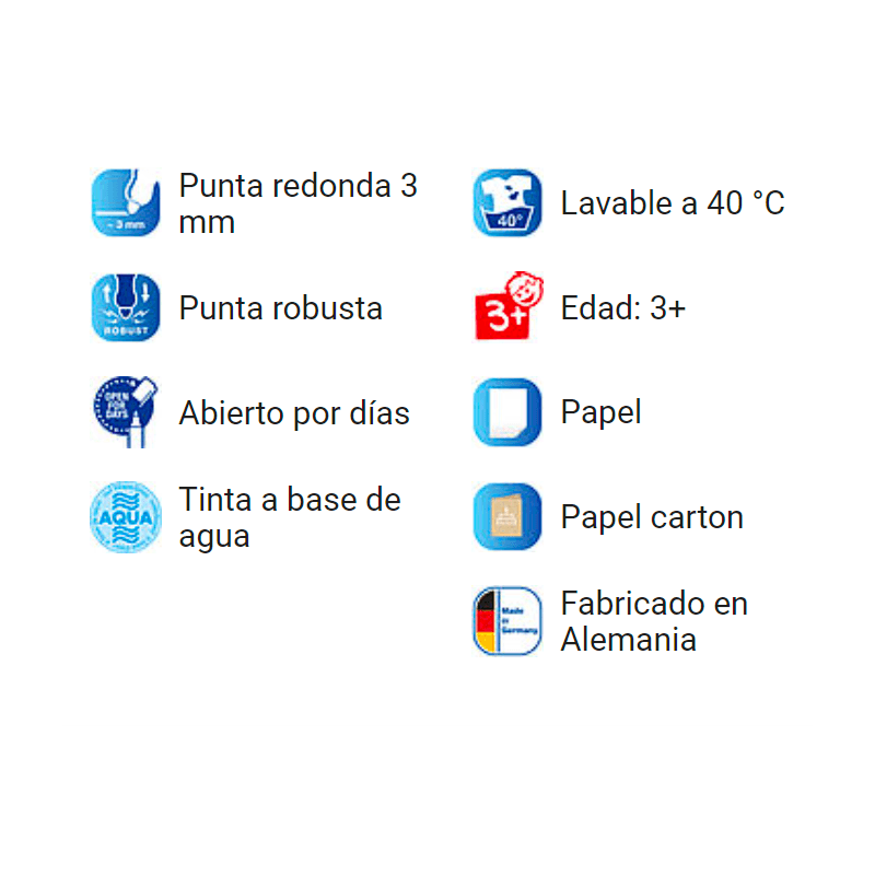 Set de marcadores para niños. Para disfrutar dibujando con un toque colorido sobre papel de color claro y cartón. La punta gruesa, redonda y suave tiene un grosor de trazo de 3 mm. La tinta a base de agua se limpia fácilmente de la piel y de la mayoría de los tejidos. Cumple la norma CE sobre juguetes adecuados para los niños. El set incluye los colores negro, rojo, azul, verde, amarillo, naranja, marrón, rosa, celeste y verde claro.