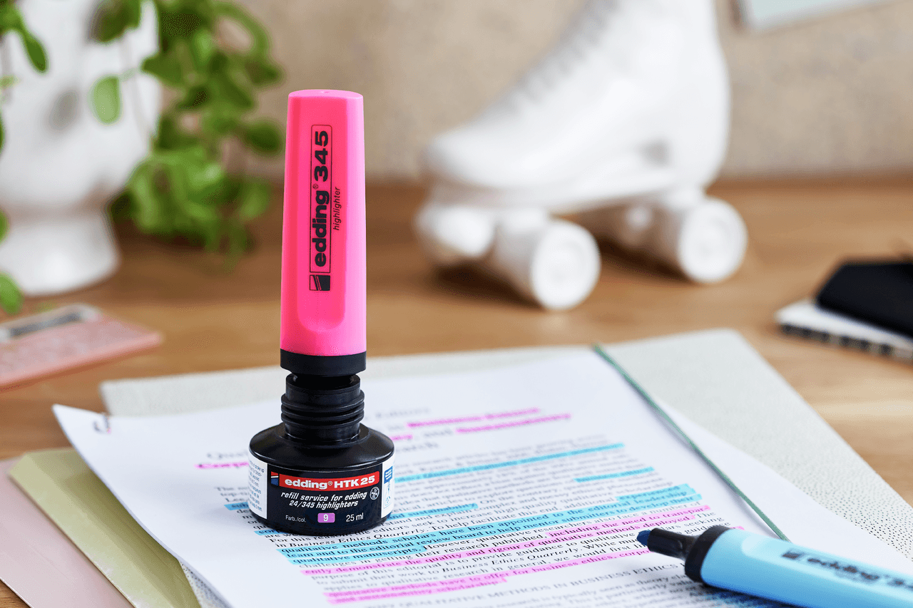 Cuando se agota la tinta de un marcador fluorescente edding, basta con dejarlo en vertical en el frasco de rellenado durante al menos una hora para que esté listo para escribir de nuevo. Una solución práctica y respetuosa con el medio ambiente para alargar la vida del marcador. Tiene un efecto beneficioso sobre el medio ambiente al tiempo que ayuda a ahorrar dinero.