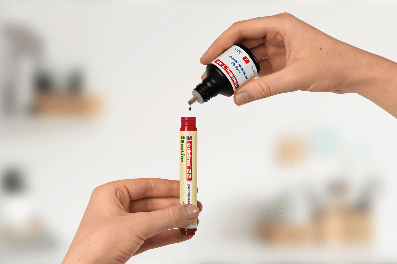 Alargar la vida de prácticamente todos los marcadores permanentes edding es muy sencillo, basta con rellenarlos cuando estén vacíos. Volverán a estar como nuevos en un abrir y cerrar de ojos. Este ingenioso dispensador por goteo no solo tiene un efecto beneficioso sobre el medio ambiente, sino que además ayuda a ahorrar dinero.